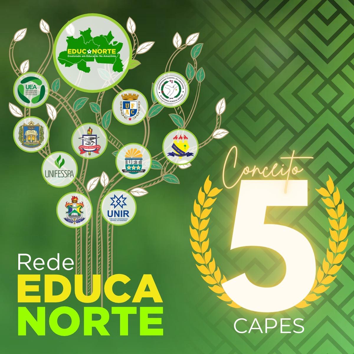 É com grande orgulho que compartilhamos uma conquista histórica para a educação na nossa região. A Rede EDUCANORTE acaba de ser avaliada com o Conceito 5 pela CAPES, consolidando-se como um programa de excelência nacional. Este resultado é o reflexo do esforço conjunto de nossas instituições parceiras, docentes e discentes que dedicam suas pesquisas ao fortalecimento do doutorado em Educação na Amazônia. Alcançar a nota 5 reafirma nosso compromisso com a qualidade acadêmica e com o desenvolvimento social e científico do Norte do país.