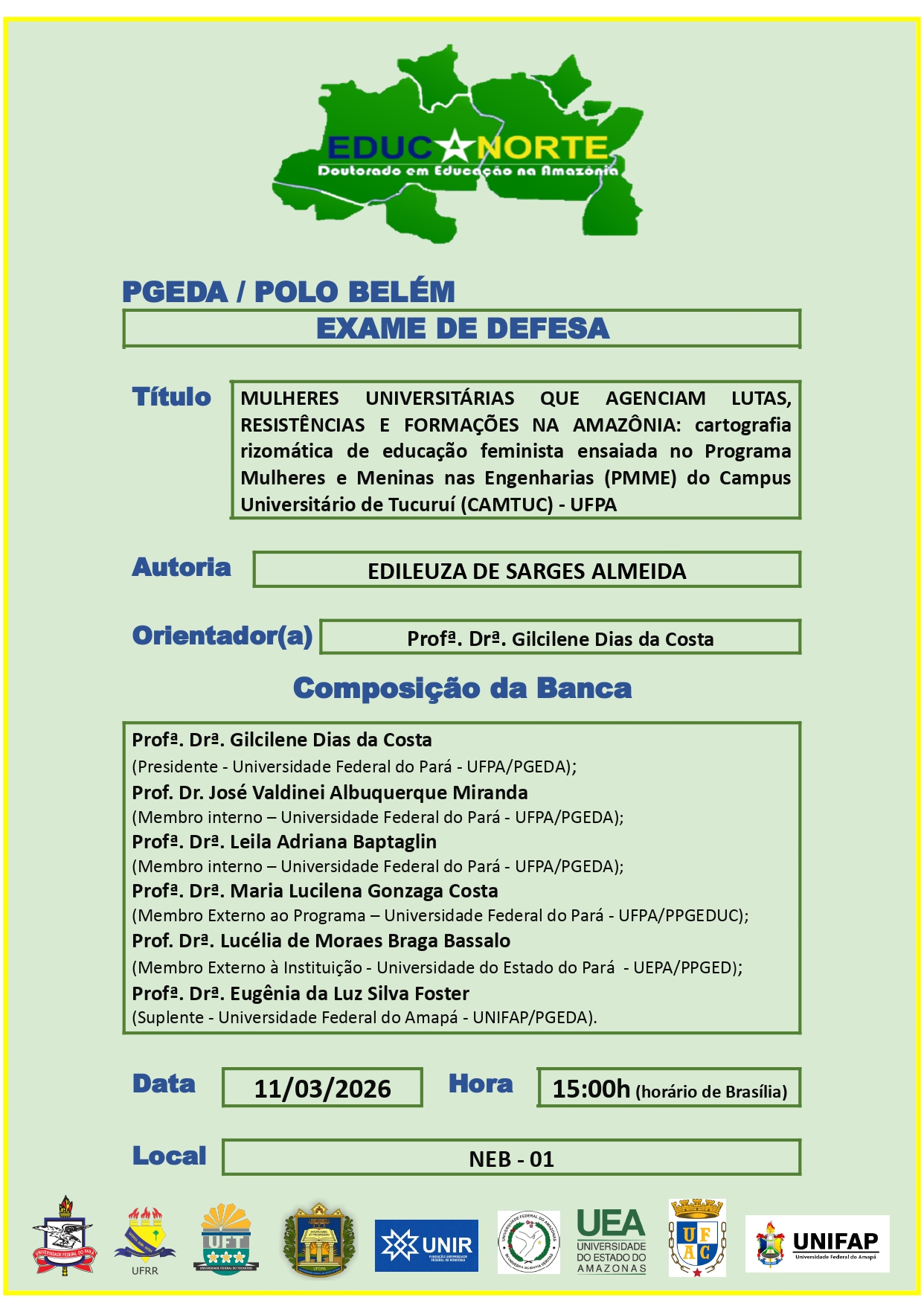 O Programa de Pós-Graduação em Educação na Amazônia - Doutorado em Rede, tem a satisfação de convidar a todos para apreciar o Exame de Defesa da Tese da Doutoranda Edileuza Sarges de Almeida, que ocorrerá no dia 11/03/2026, às 15h00 (horário de Brasília), na sala NEB-01.