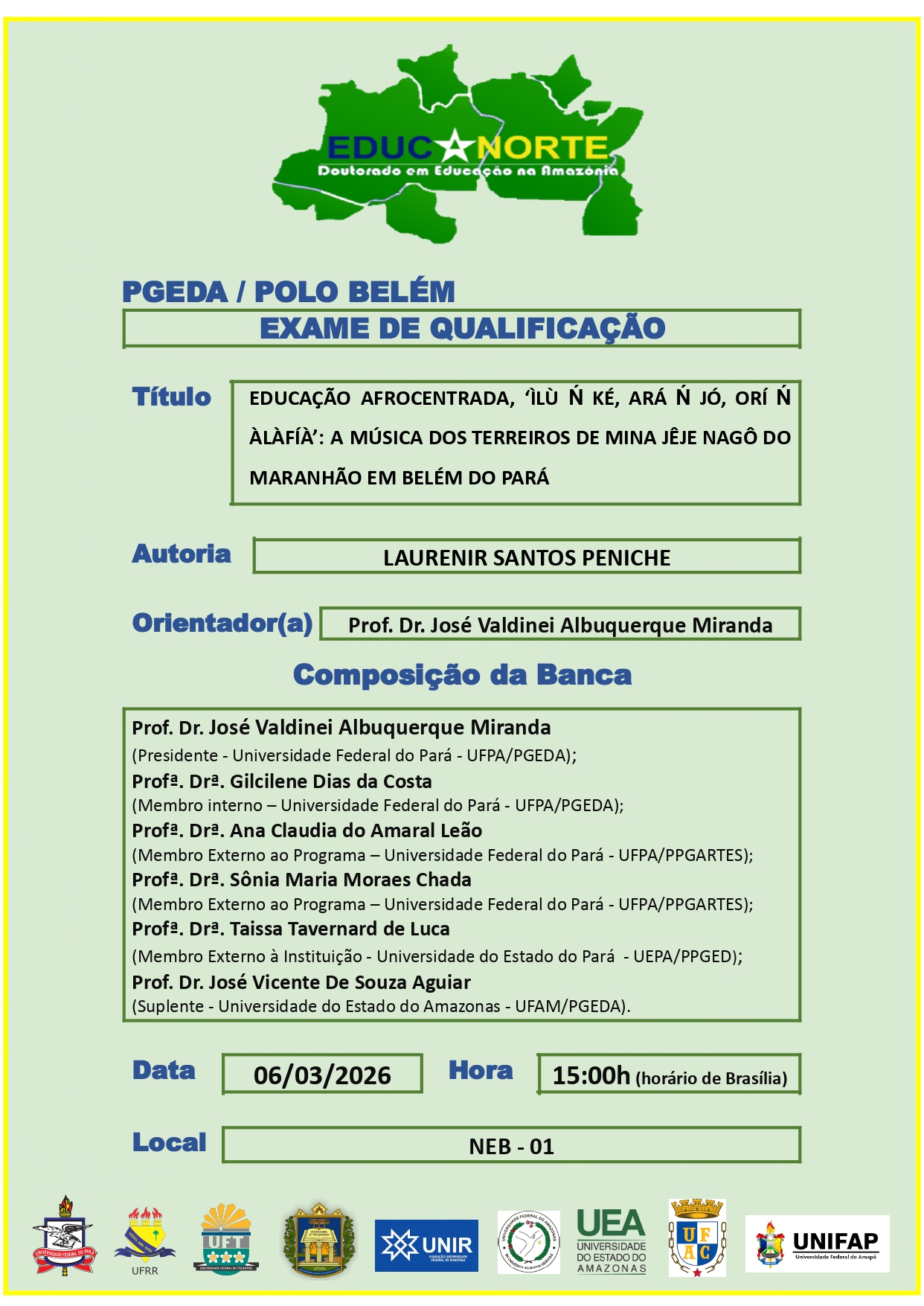 O Programa de Pós-Graduação em Educação na Amazônia - Doutorado em Rede, tem a satisfação de convidar a todos para apreciar o Exame de Qualificação da Doutoranda Laurenir Santos Peniche , que ocorrerá no dia 06/03/2026, às 15h00 (horário de Brasília), na sala de aula NEB 01.