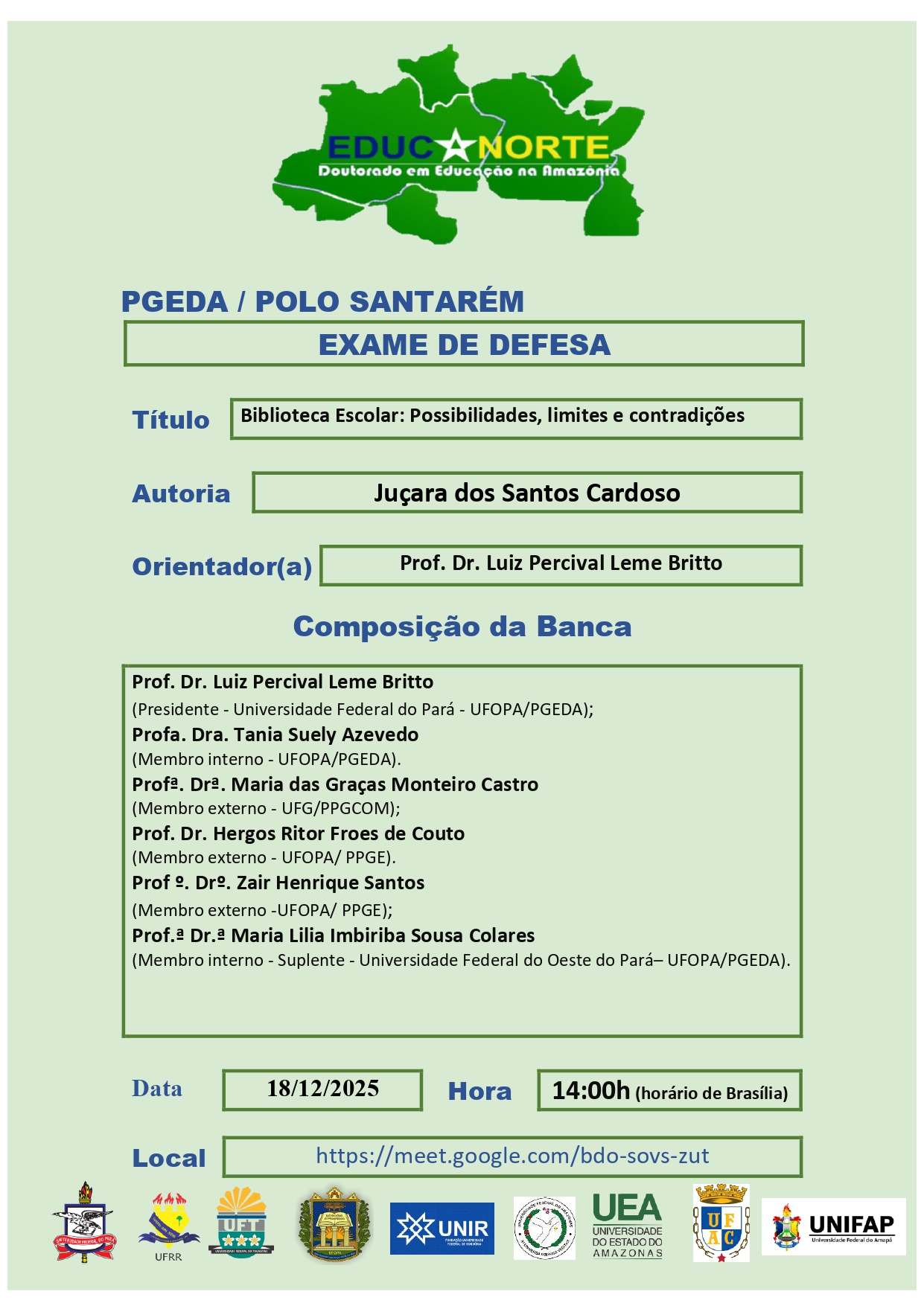 O Programa de Pós-Graduação em Educação na Amazônia - Doutorado em Rede, tem a satisfação de convidar a todos para apreciar o Exame de Defesa da Tese da Doutoranda, Juçara dos Santos Cardoso que ocorrerá no dia 18/12/2025, às 14:00h (horário de Brasília), na sala virtual: https://meet.google.com/bdo-sovs-zut
