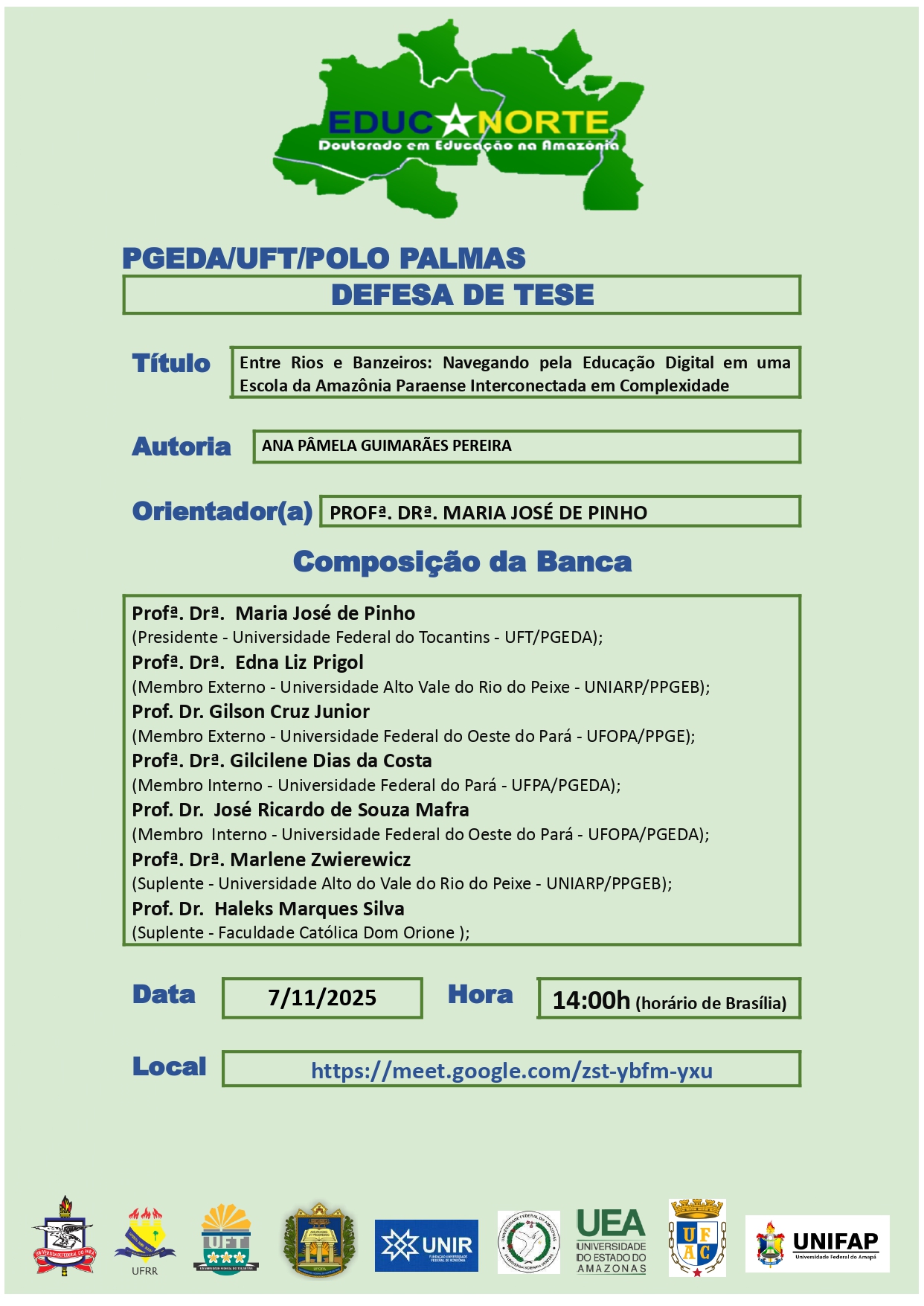 O Programa de Pós-Graduação em Educação na Amazônia - Doutorado em Rede, tem a satisfação de convidar a todos para apreciar o Exame de Defesa da Tese da Doutoranda, Ana Pâmela Guimarães Pereira que ocorrerá no dia 07/11/2025, às 14:00h (horário de Brasília), na sala virtual: https://meet.google.com/zst-ybfm-yxu.