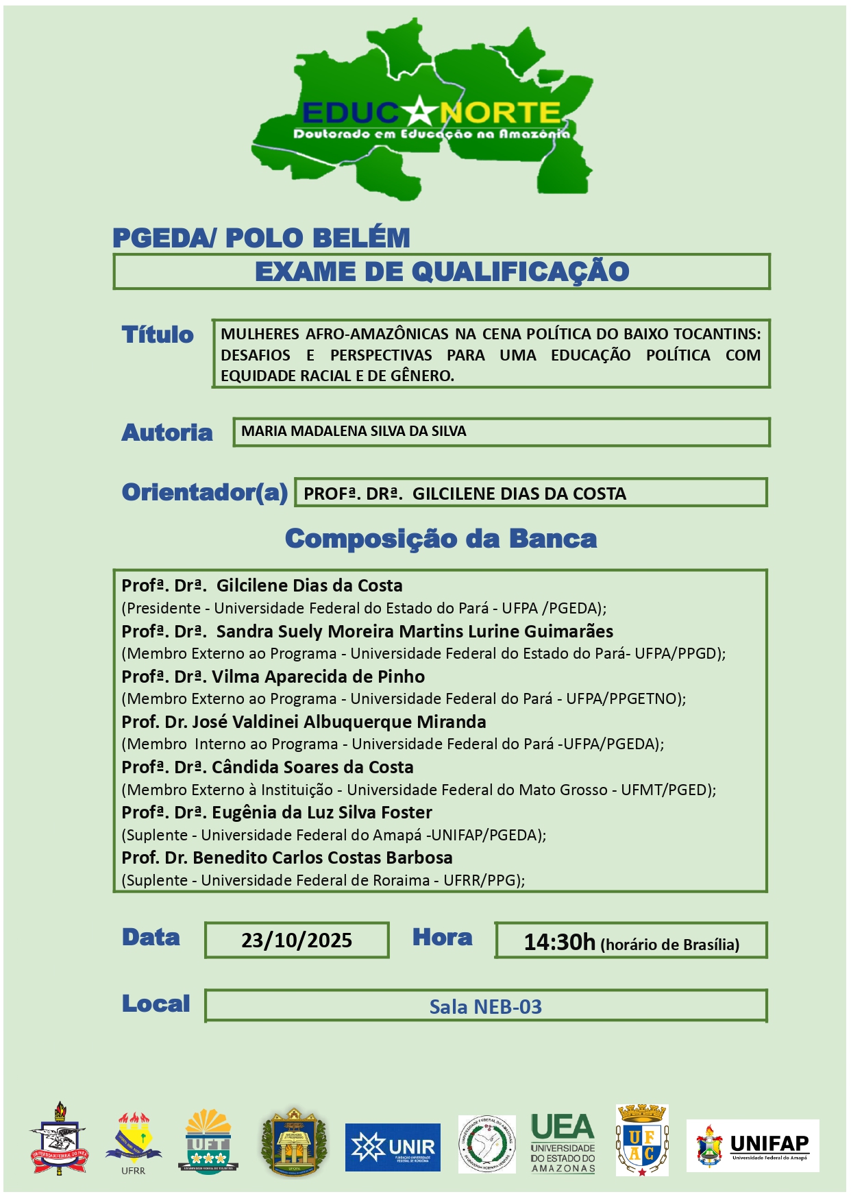 O Programa de Pós-Graduação em Educação na Amazônia - Doutorado em Rede, tem a satisfação de convidar a todos para apreciar o Exame de Qualificação da Doutoranda Maria Madalena Silva da Silva , que ocorrerá no dia 23/10/2025, às 14h30(horário de Brasília), na sala de aula NEB 03.